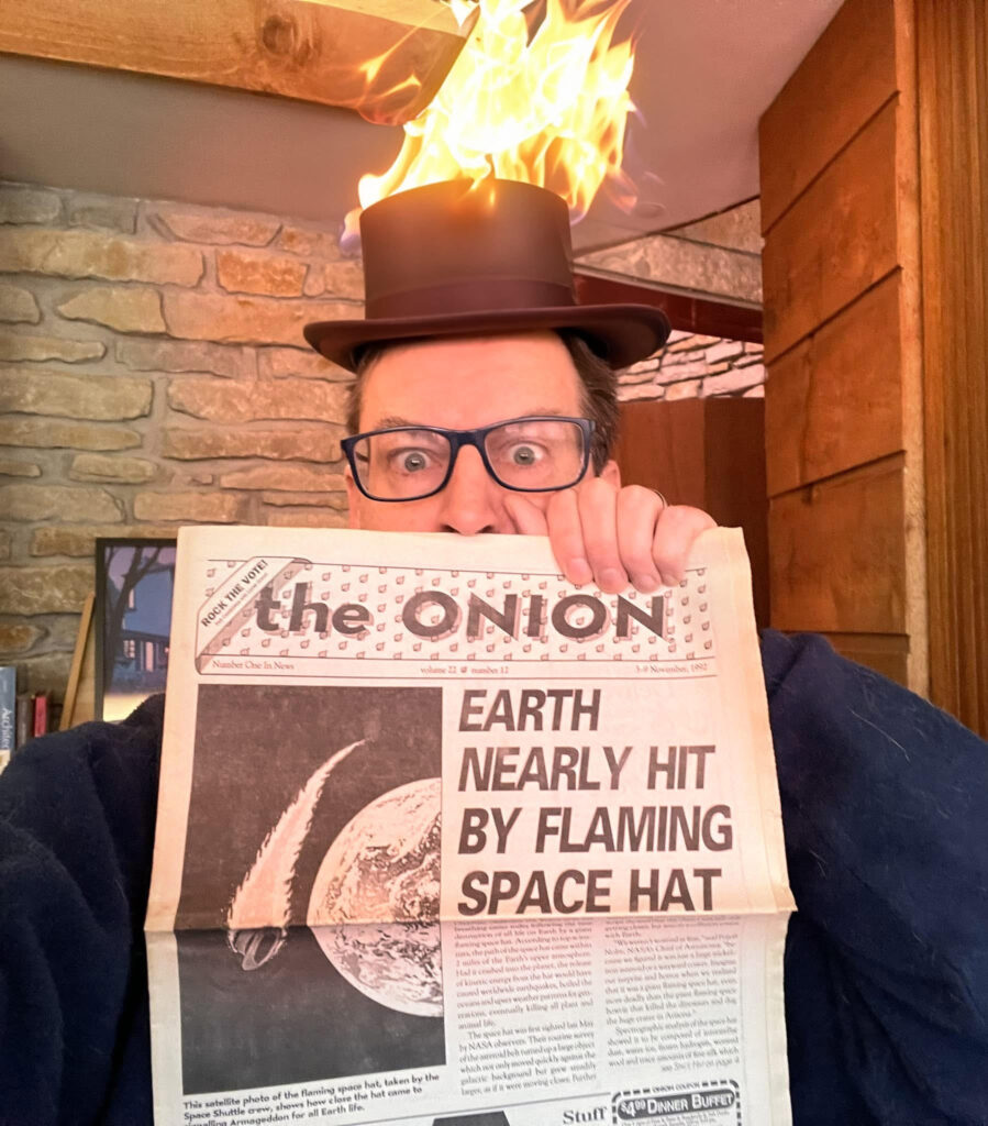 Scott Templeton arrived at UW–Madison as an undergraduate in 1990, two years after the founding of The Onion. He was an instant fan and began collecting issues. His original career plan was to become a foreign language teacher, but picked up some other skills along the way and, a month or two after graduating in 1994, managed to land the graphic design position at The Onion he held for 8½ years. The highlight of his time there was as art director and principal designer of The Onion’s first book, Our Dumb Century. Twenty-six years after its release it remains the design project he is most proud of.